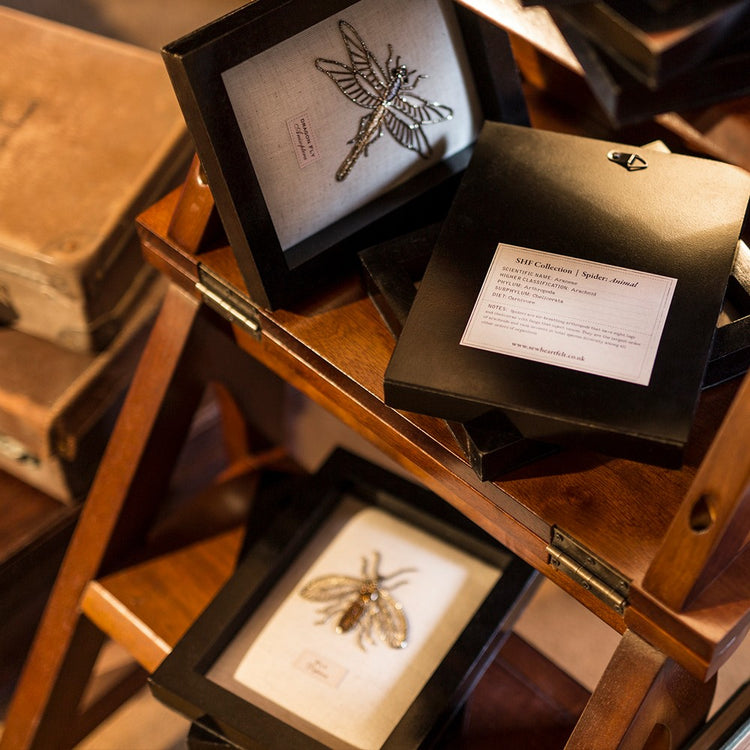Hundreds of tiny glass beads and intricate layers of sequins applied with tremendous skill...and patience.. map out the colours and distinctive patterns of the Feeler Beetle. Padded from behind this forms the domed body of the creature. It is then mounted in a box frame with a fun archivist latin description denoting the genus of the beastie on the reverse!