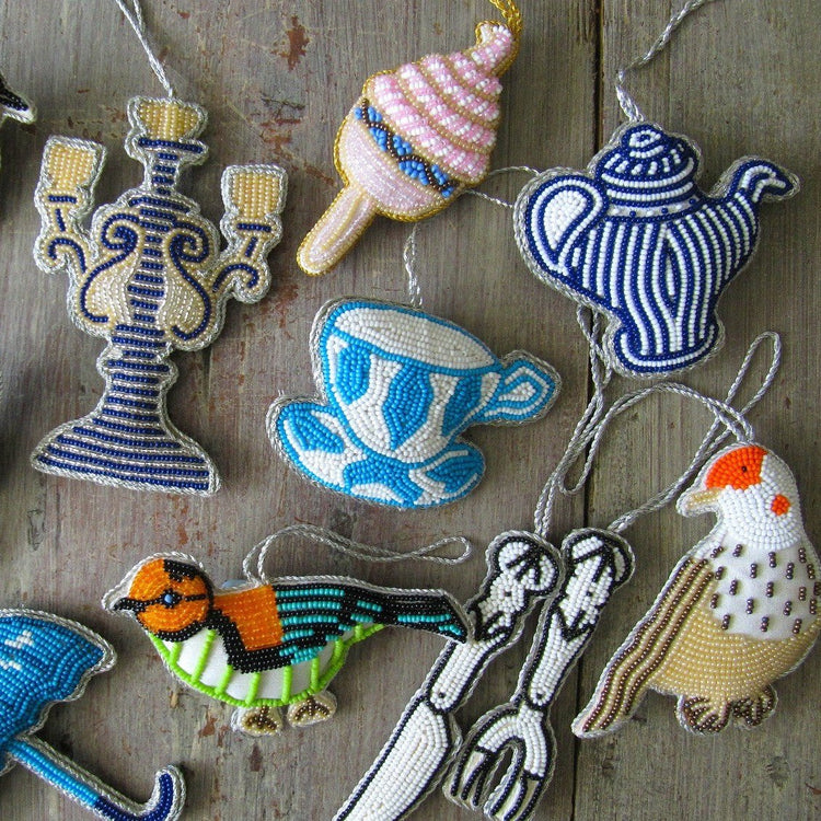 Skilfully hand beaded Christmas decorations are made by sewing delicate pretty fine glass beads onto coloured silk material. These lovely decorations are the perfect addition to any traditional Christmas tree!